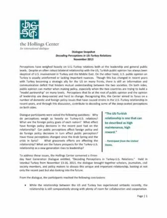 To address these issues, the Hollings Center convened a three-day Next Generation Dialogue entitled, “Decoding Perceptions in Turkey-U.S. Relations.” Held in Istanbul Turkey from November 13-16, 2013, the dialogue brought together scholars, journalists, civil society members, and policy makers to discuss this unique and important relationship, looking at not only the recent past but also looking into the future.